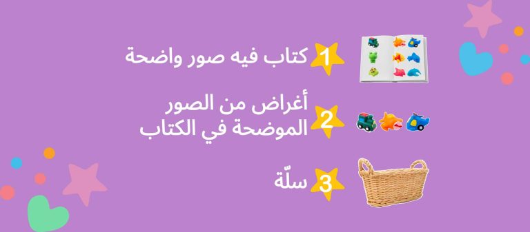 ابدأوا بقراءة الكتاب والإشارة إلى الأغراض الموضّحة في الكتاب ومن ثمّ أخرجوا الشيء ذاته من السلّة. مثال على ذلك: إذا كان هنالك صورة لكرة في الكتاب قولوا: “هيّا نجد كرة من حولنا” إذا كانت الكرة من لون مختلف أو حجم مختلف اذكروا ذلك “هذه كرة ولكن هذه الكرة مختلفة اللون فهذه لونها أحمر والتي في الكتاب لونها برتقالي”.